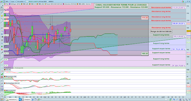 Le cours évolue toujours à l’intérieur du canal haussier moyen terme dont la droite de support se situe à 101.60€, la ligne de résonance à 112.60€ et la droite de résistance à 123.60€ pour la séance du lundi 23 mai 2022.